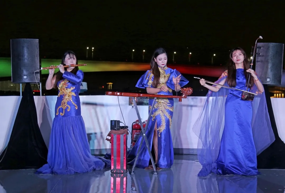 微風(fēng)拂面,夜景怡人,滿載游客的3艘邕江游船來回穿梭在邕江之上,沿江兩岸燈光絢麗多彩,跨江大橋恢弘大氣,民樂表演風(fēng)情十足,乘船游客紛紛拿出手機、相機合影留念。