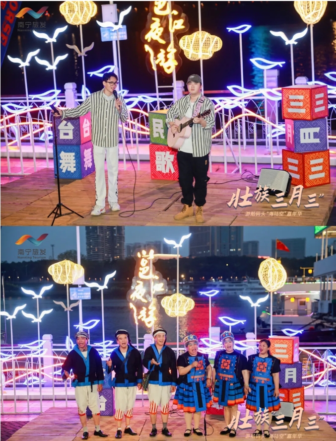 三月三期間,民生旅游碼頭邕江夜游項(xiàng)目推出穿民族服飾免費(fèi)乘坐特定航班、躉船民族服飾試裝區(qū)、演奏非遺獨(dú)弦琴、滑板+陸沖極限運(yùn)動(dòng)賽、潮流音樂(lè)精良打酒站、少兒鴻鵠樂(lè)坊快閃等精彩活動(dòng),讓市民和游客們?cè)谶@個(gè)廣西特有的節(jié)日里感受到了濃厚的民族文化氛圍和節(jié)日的歡樂(lè),成為了市民和游客們歡度佳節(jié)的熱門選擇,留下了美好的回憶。