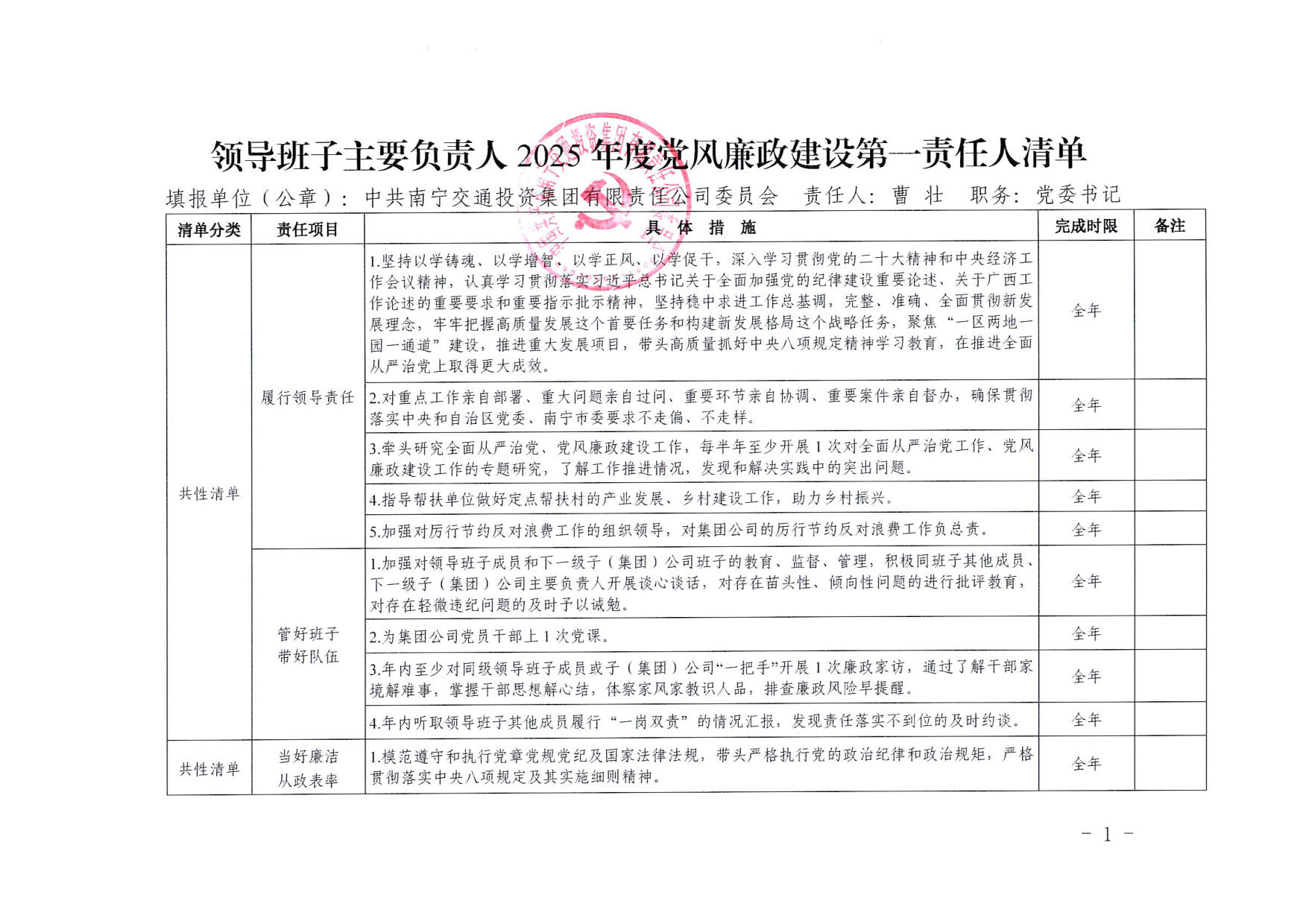 南寧交投集團領(lǐng)導(dǎo)班子2025年度黨風廉政建設(shè)主體責任清單