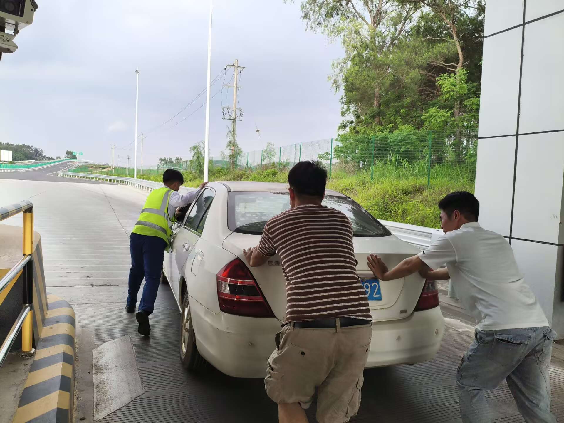 6月14日15時許,在林橫高速洋橋收費站,一輛小轎車在下高速時因發(fā)動機故障滯留在車道中并伴有白煙冒出,因事發(fā)時正逢暴雨,情況險急。當班收費員周秋吉、吳星煒察覺異常后第一時間上報監(jiān)控中心并開啟備用車道,迅速引導后方車流安全有序轉移,同時取用滅火器隨時準備應對突發(fā)情況。在確認車輛無法啟動且白煙仍在持續(xù)冒出時,收費員冒雨協同司乘將車輛推離車道,轉移至收費站外廣場安全地帶停放,并幫助司乘聯系拖車,暖心服務讓司乘連連“點贊”。